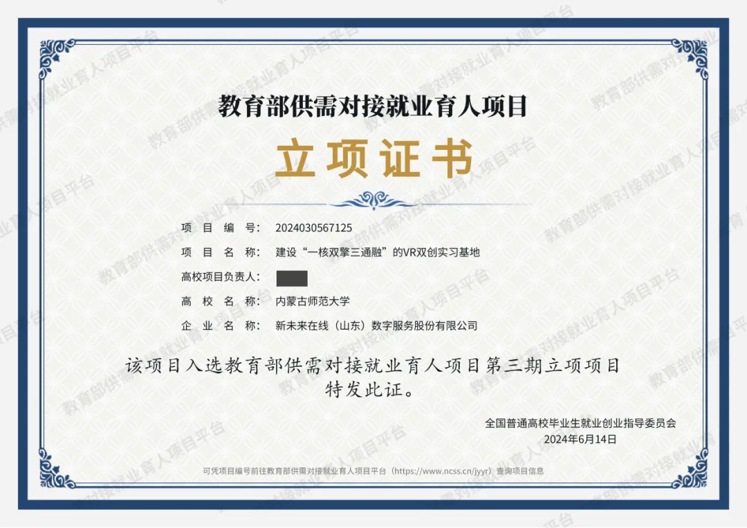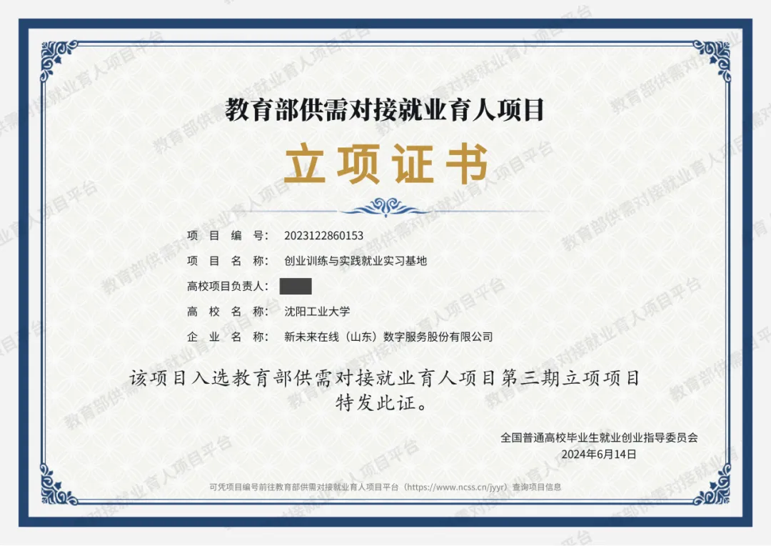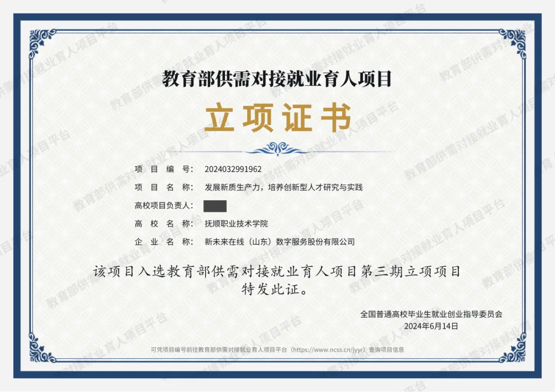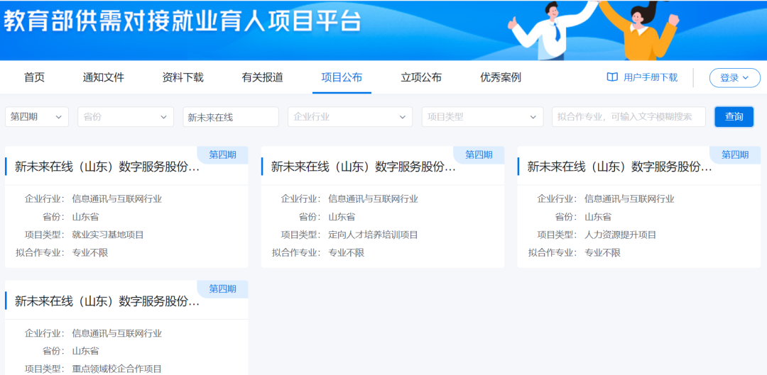 教育部供需对接就业育人项目平台公布了今年第四期项目名单。新未来在线(山东)数字服务股份有限公司入选教育行业类四项名单,分别为就业实习基地项目、定向人才培养培训项目、人力资源提升项目、重点领域校企合作项目。