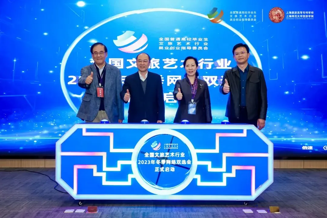 上海市教委学生处处长丁良(左一),“文旅艺就指委”主任、中央美术学院党委副书记王晓琳(右二),上海旅游高等专科学校校长康年(左二),教育部高校学生司就业服务处王小龙(右一)共同启动全国文旅艺术行业2023年冬季网络双选会