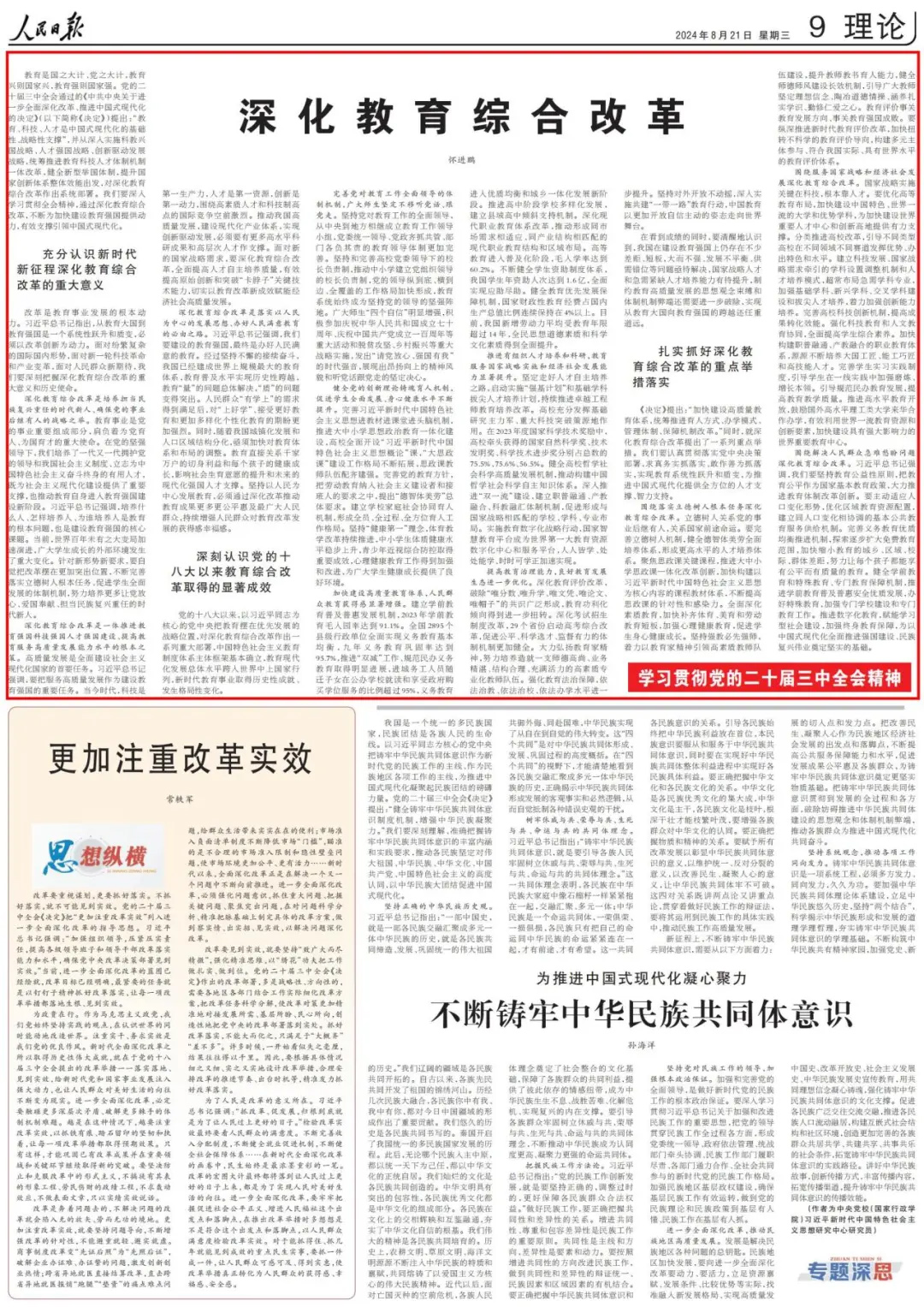 8月21日,《人民日报》“学习贯彻党的二十届三中全会精神”专栏,刊发教育部党组书记、部长怀进鹏署名文章《深化教育综合改革》。
